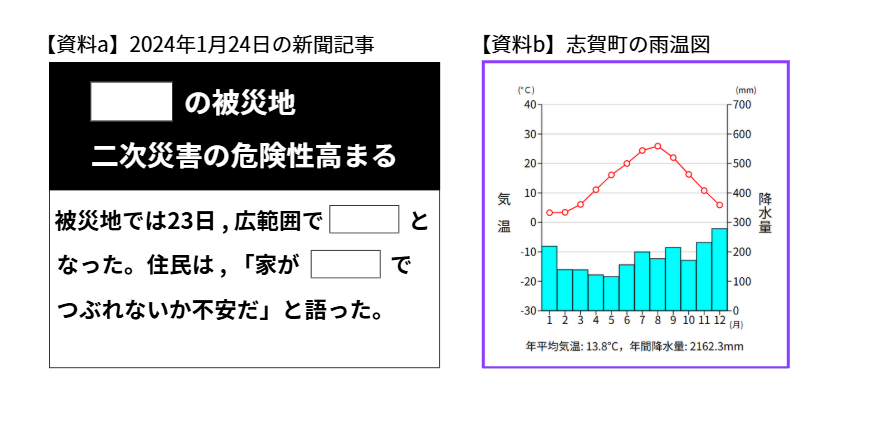 「石川県志賀町は、今年(令和6年)1月1日に発生した能登半島地震で大きな被害を受けました。次の資料aは、1月24日に発行された新聞記事です。□に当てはまる言葉を、資料bを参考にして答えなさい。ただし3つの□には同じ言葉が入ります。」