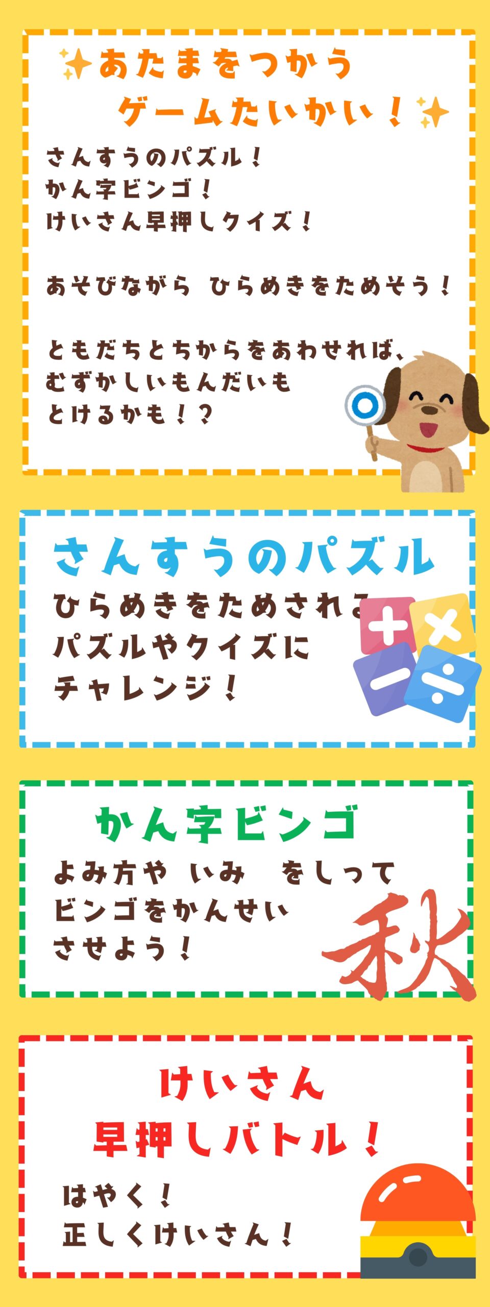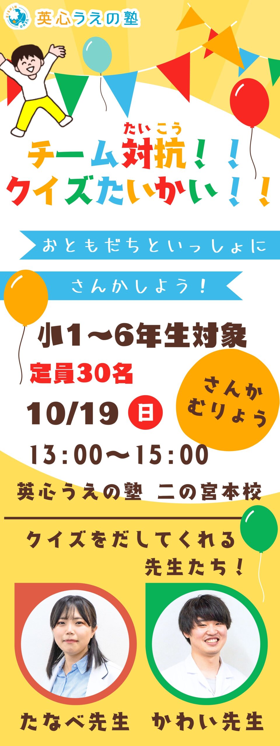 TOP > 新着情報 > お知らせ > 【定員30名!10/19(日)開催!】小1〜6対象 チーム対抗クイズ大会!