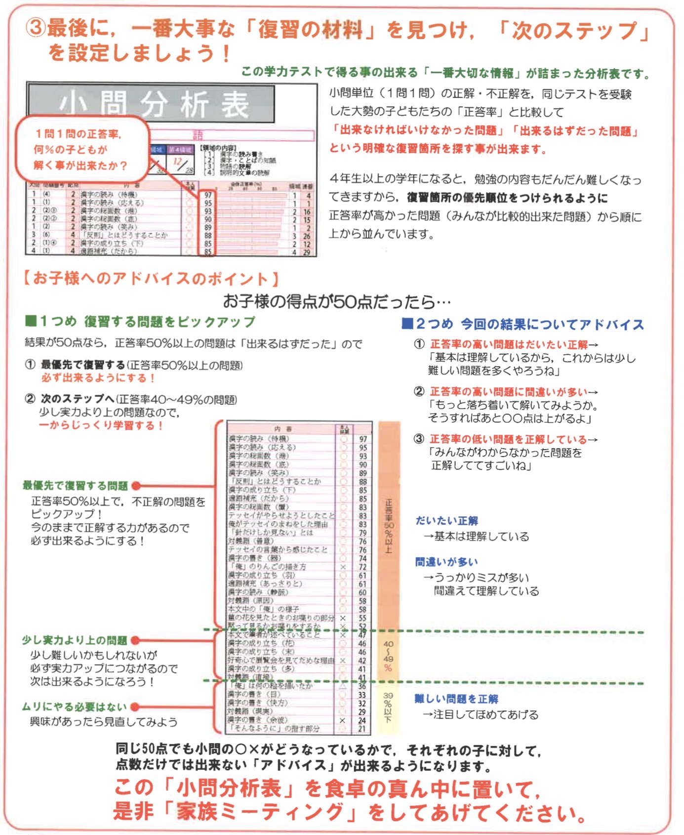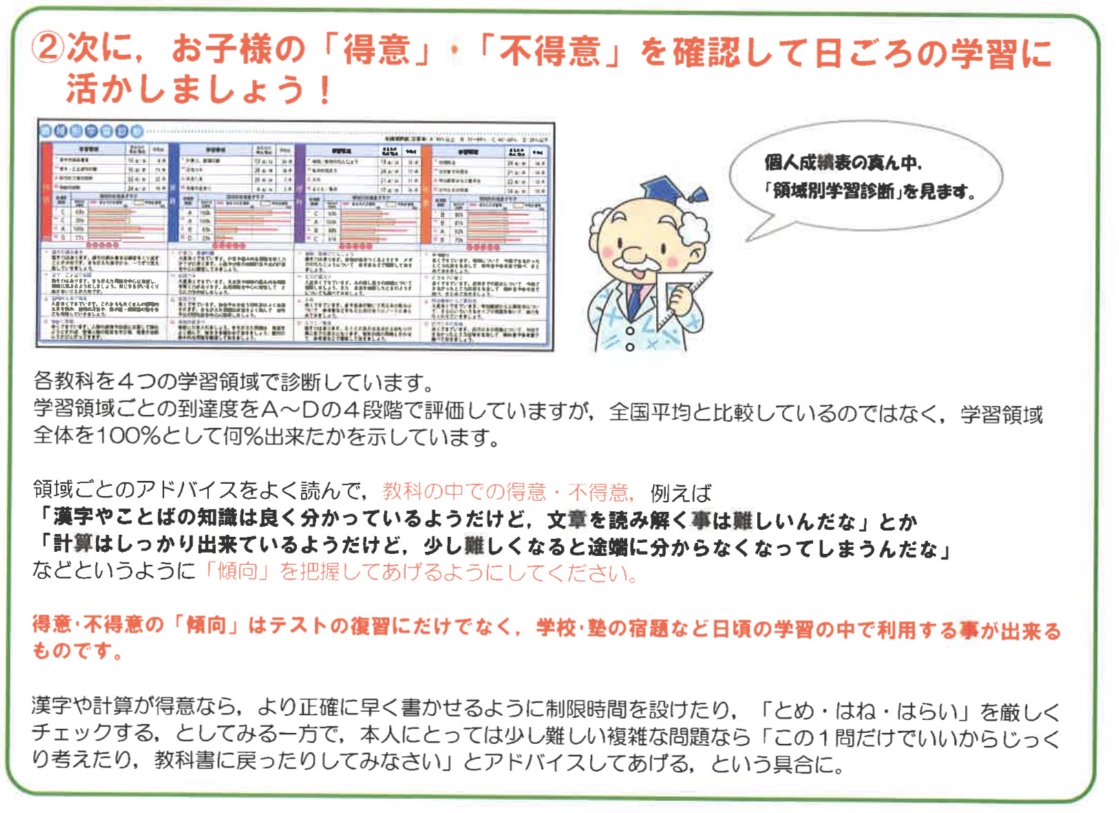 得点や順位だけでなく、分析表をもとに「次の一歩」を親子で話し合うことが、確かな学力を育てる近道です。